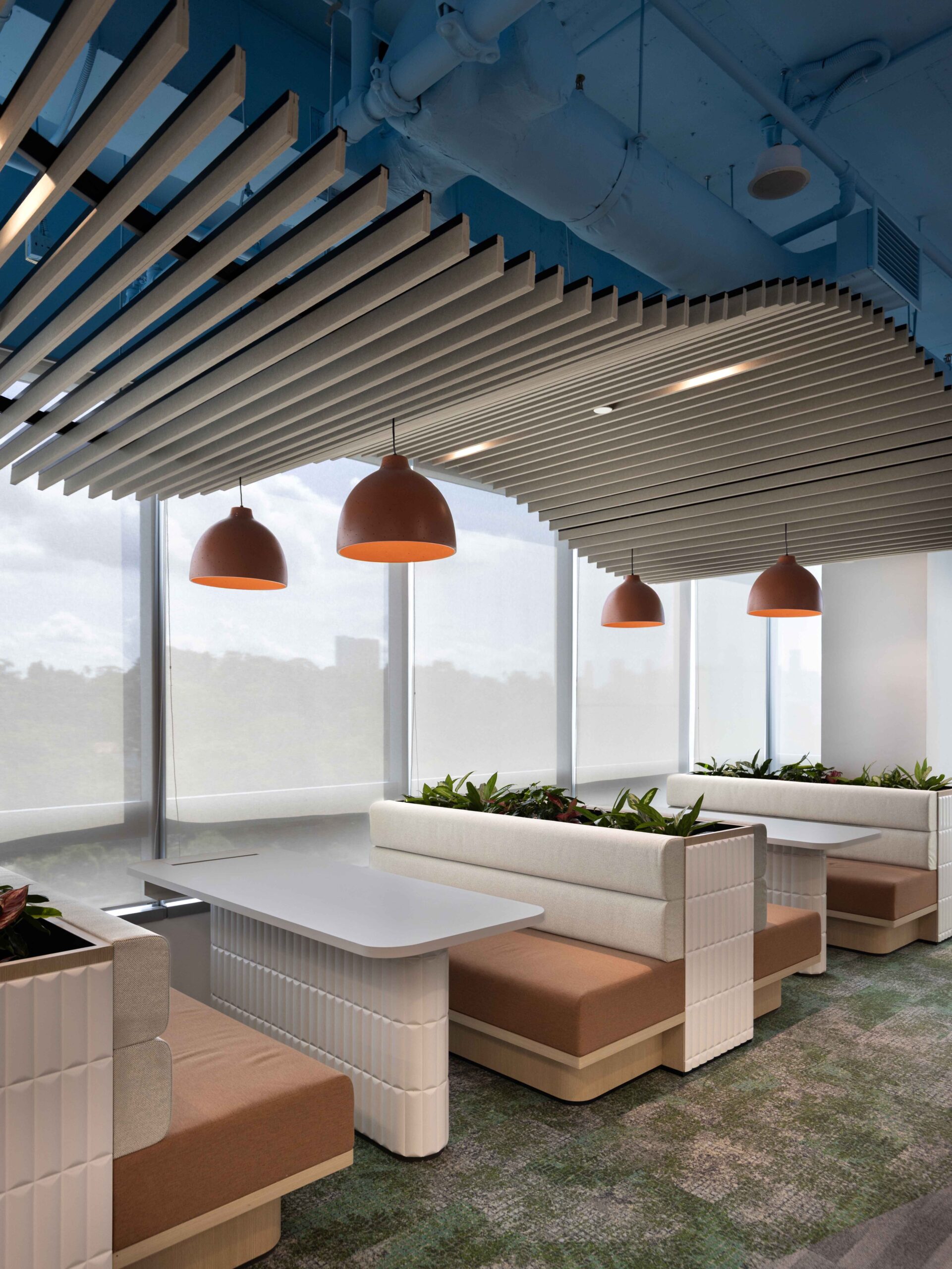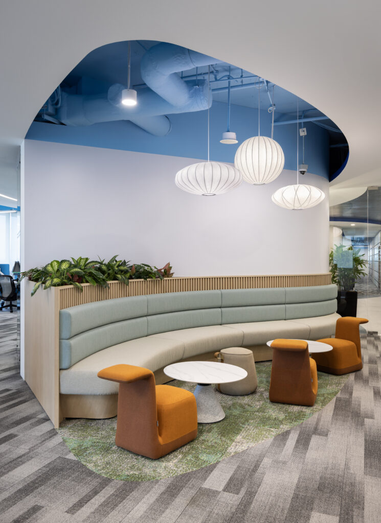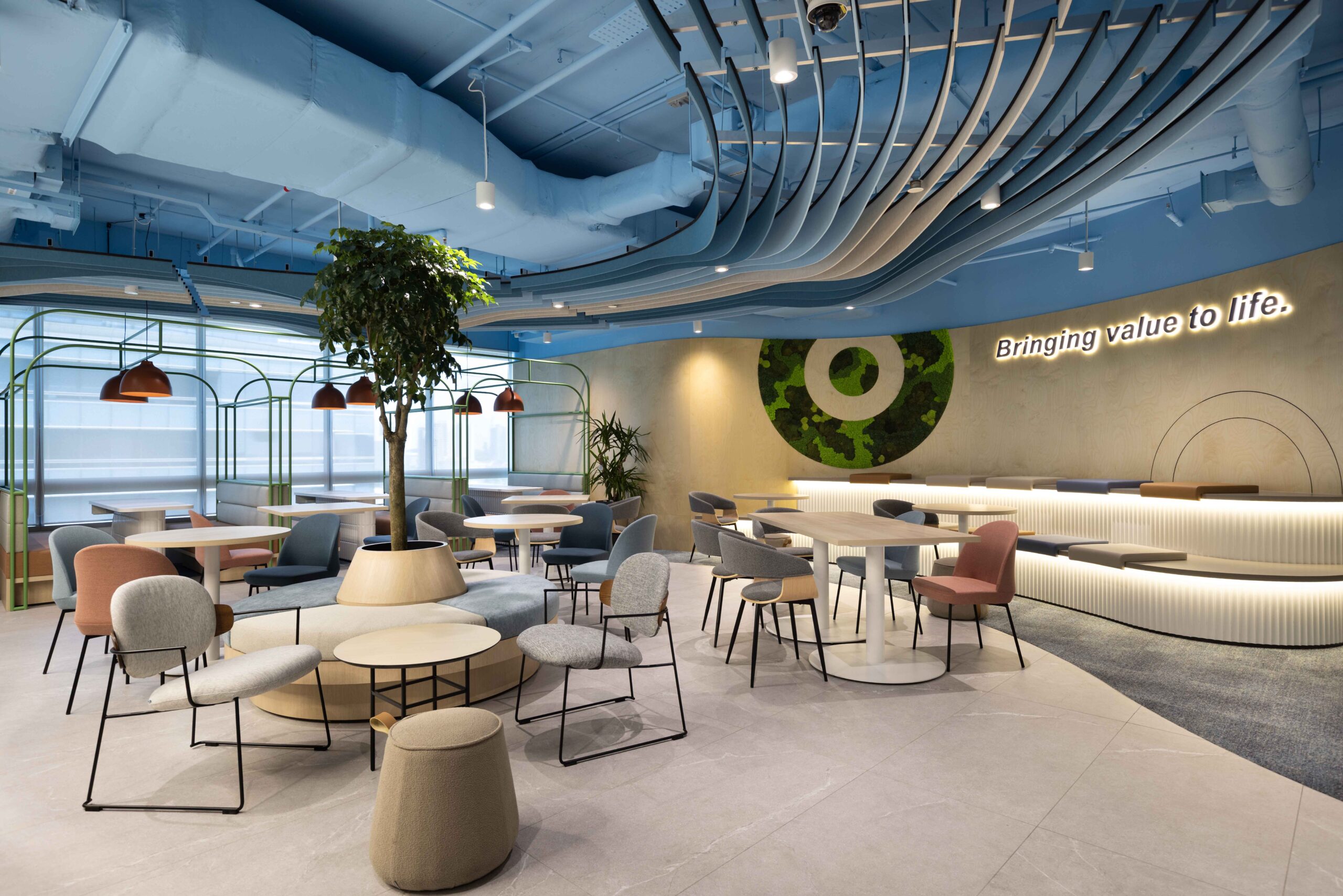波浪灵感的天花板、柔软座椅与自然的设计元素,共同营造灵活协作的团队空间。