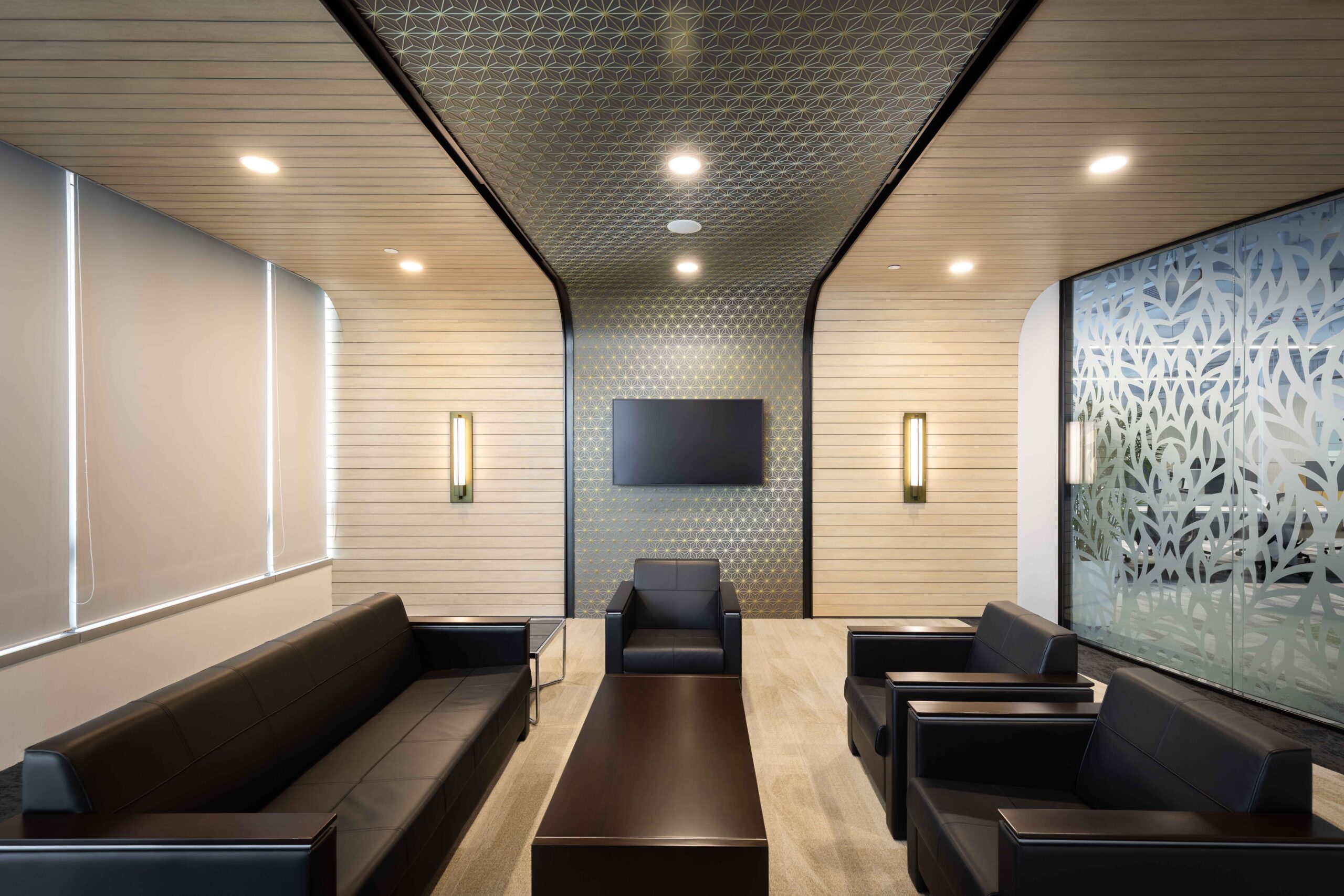 贵宾室以静谧典雅为格调,设计灵感源自日本工艺与传统。弧形木质墙面与富有纹理的天花无缝衔接,形成特色墙面,营造出如茧般的私密空间,让来客得以专注休憩。带有自然纹理的磨砂玻璃为空间注入现代生机,以当代方式致敬 NYK 的传统文化根基。
