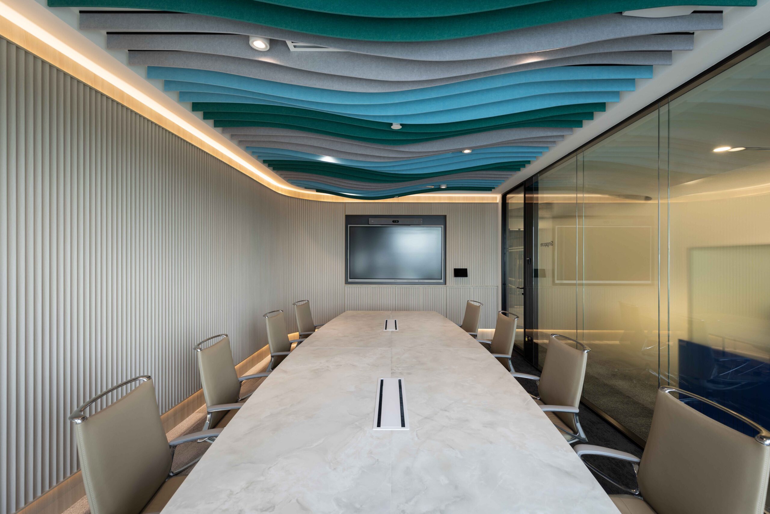 波浪造型天花与精致饰面营造出宁静而专注的会议环境。