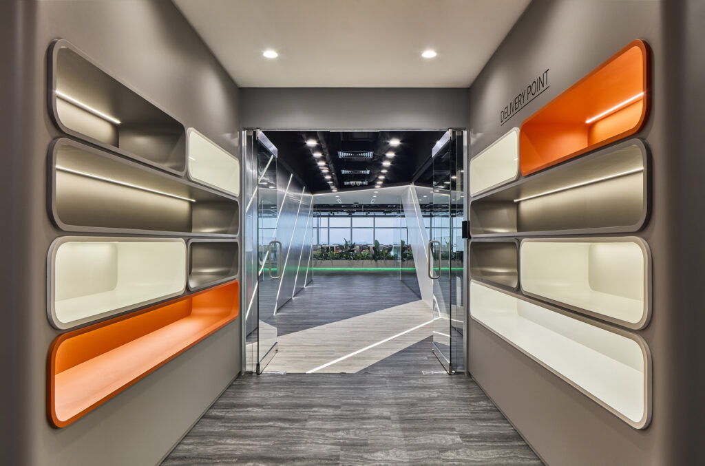 这个交付点作为对称的未来主义入口廊厅,定义了办公室的高科技品牌形象。