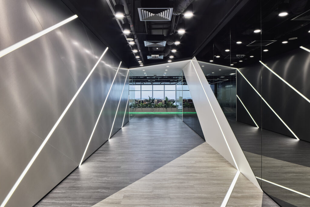 一条引人注目的走廊,金属墙板与镜面嵌入斜向内嵌式的LED灯带,营造出动态的“曲速”视觉效果
