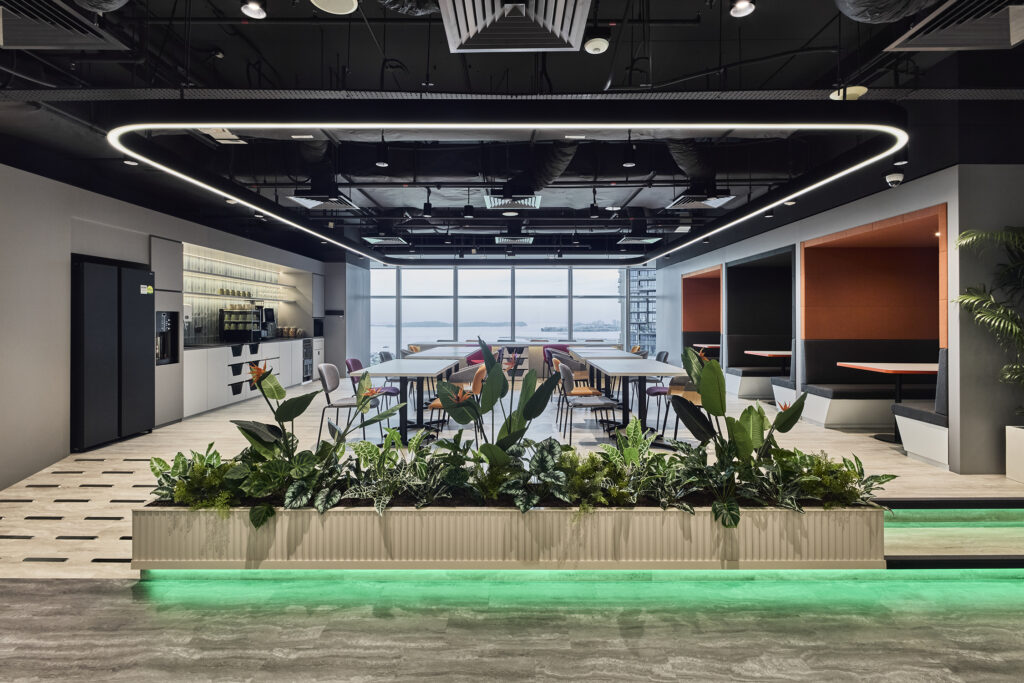 在工作空间的核心区域,这个咖啡馆风格的枢纽用活力与社群凝聚力锚定了办公室整体的基调。抬高的平台和定制的新加坡天际线壁画,巧妙平衡了粗犷工业美学与葱郁的生物亲和力。这个多功能空间以充满活力的温馨环境为主题,支持员工在此补充能量、进行非正式协作及举办里程碑庆祝活动。