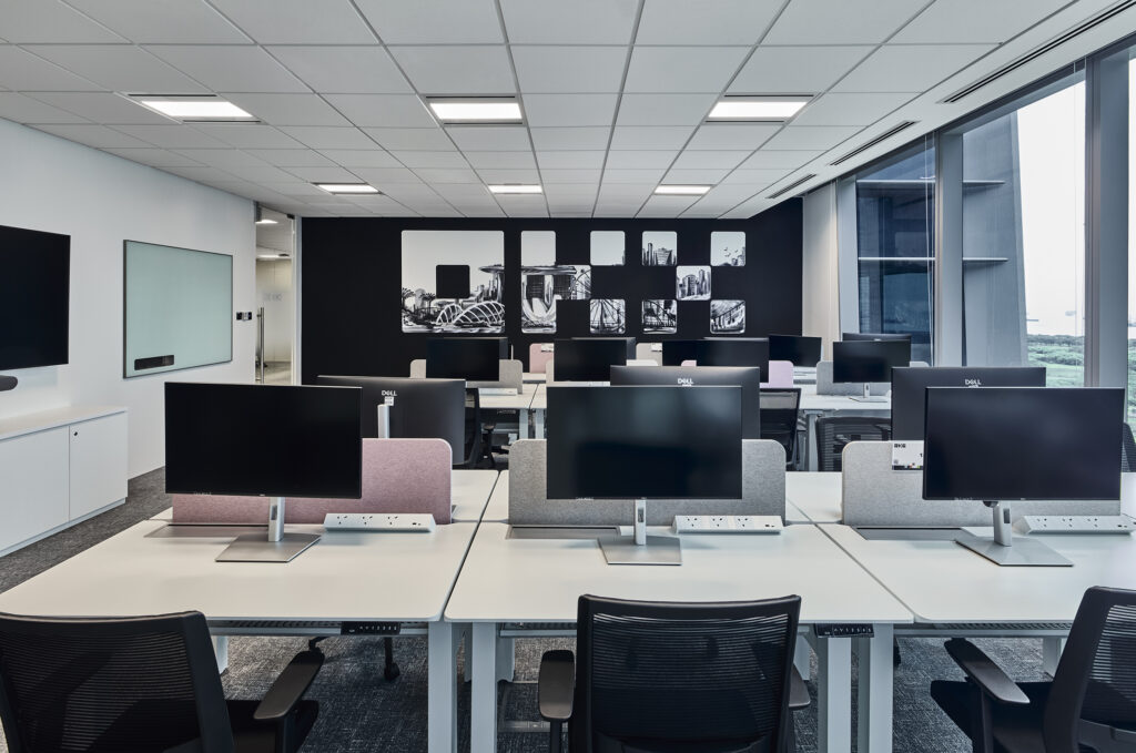这处封闭式工作站环境旨在支持持续专注和精准操作。宽敞的窗户引入充沛的自然光,单色主题墙将碎片化的OKX 品牌标识与本土艺术创作相结合,为空间提供鲜明的视觉标识。