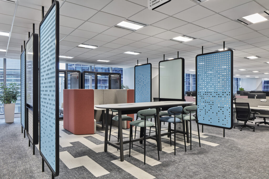一个充满活力的协作区,配有隔音舱和装饰性穿孔屏风,在开放性与私密性之间取得平衡。