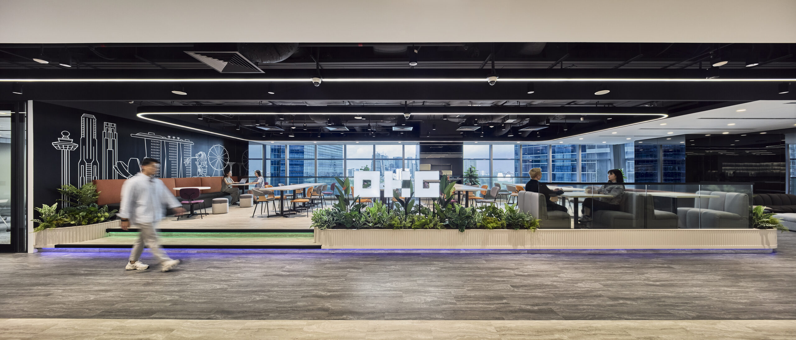 作为主要的社交枢纽,设有抬高的平台、融合绿植景观及定制的天际线壁画。