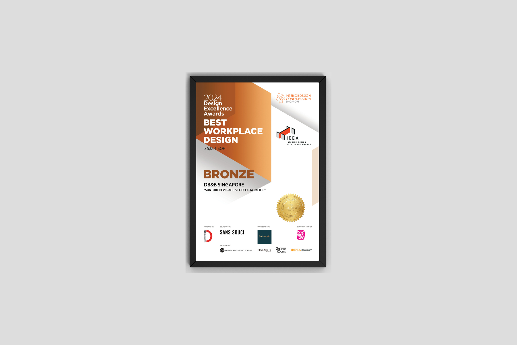 SINGAPORE – Building on its history of success, leading office interior design firm DB&B Singapore has been recognized with a Bronze Award for Best Workplace Design (≥ 5001 sqf) for their innovative design of Suntory Beverage & Food Asia Pacific‘s new office. This accolade further strengthens DB&B’s reputation for excellence, joining its portfolio of past award-winning projects for notable clients such as Amazon, SAP and DB&B Singapore offices.