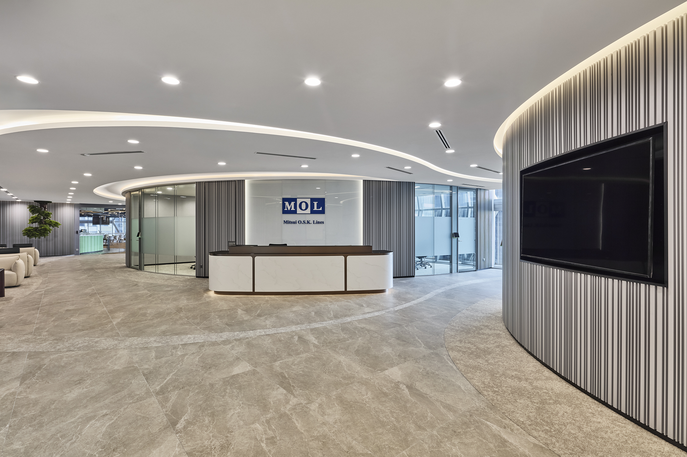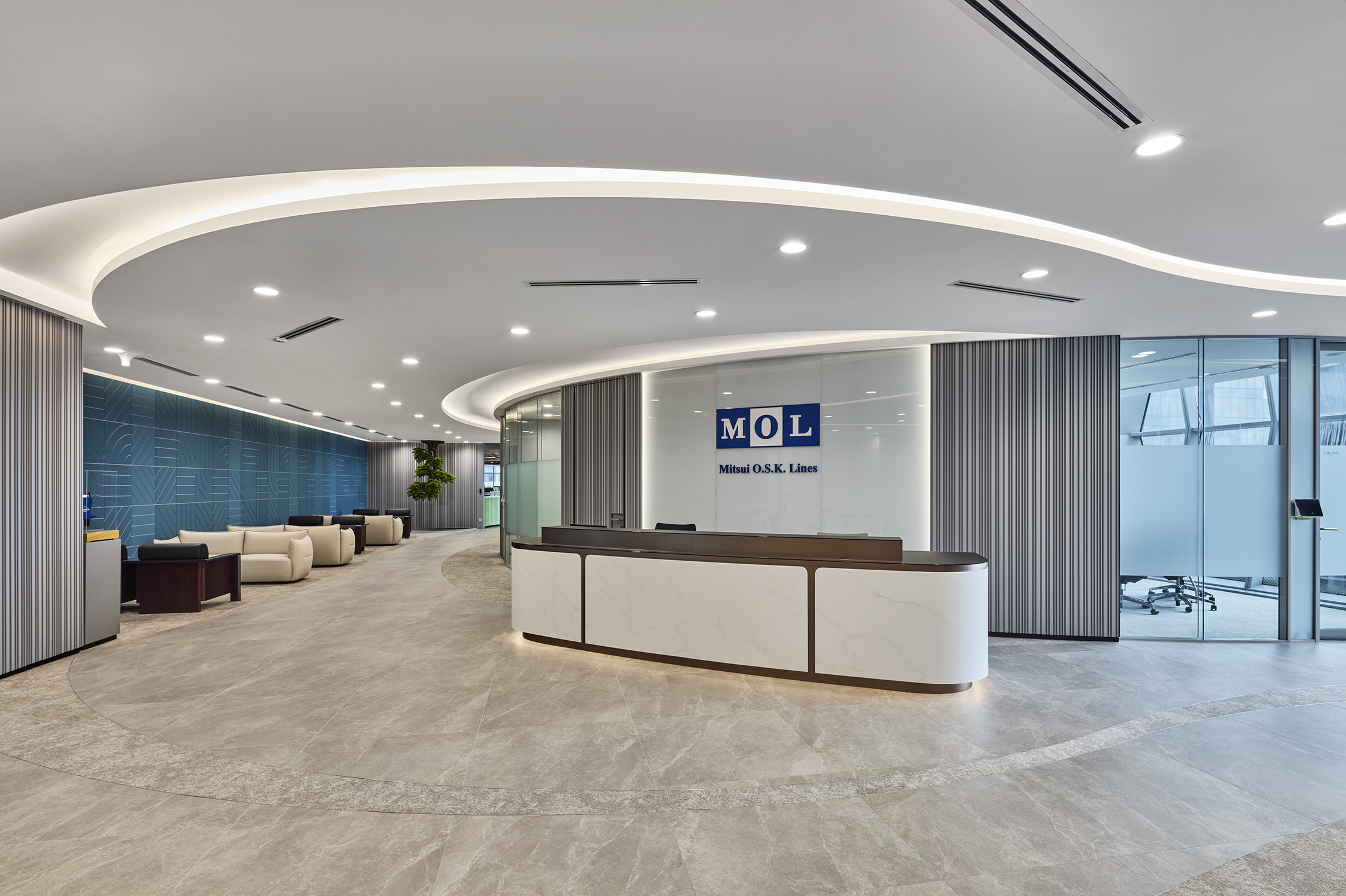 As part of the refurbishment, the reception is reimagined to enhance both arrival experience and spatial continuity. Defined by a soft curvilinear language, the space introduces a fluid and welcoming transition into the workplace while maintaining MOL’s established sense of professionalism and clarity.