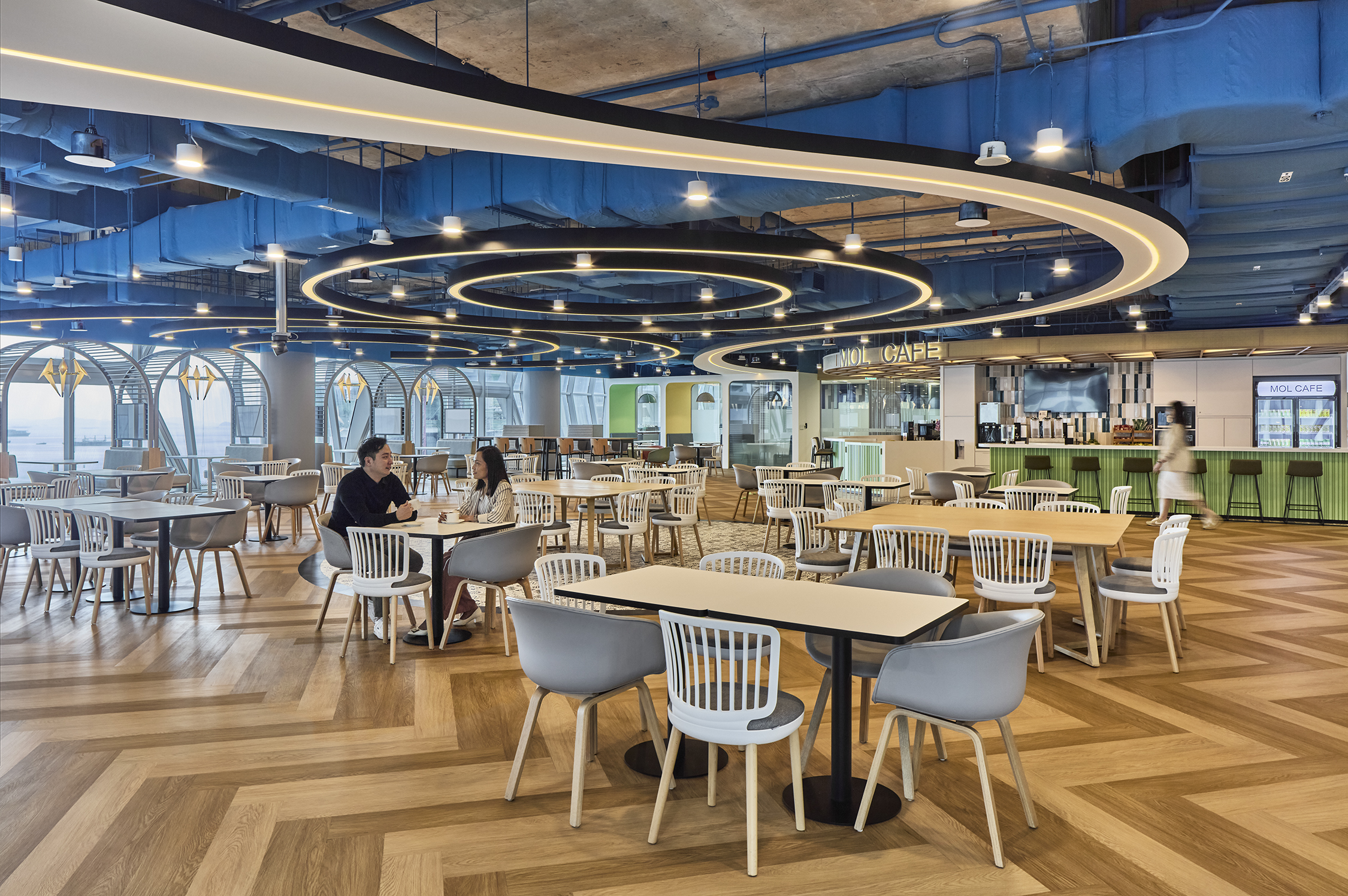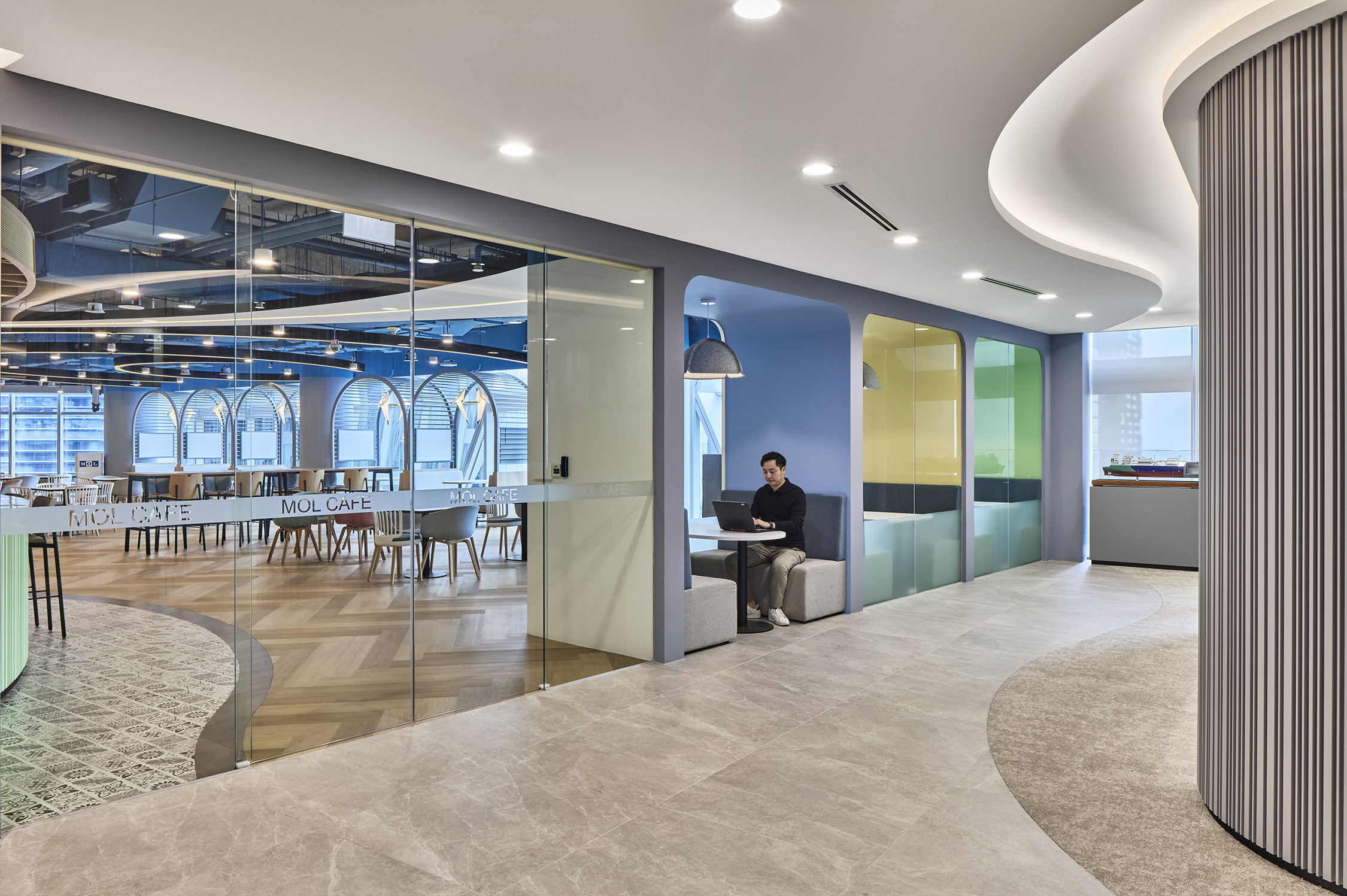 The design builds upon the original workplace concept, refining and extending its language to reflect MOL’s ongoing growth while maintaining consistency across the overall environment.