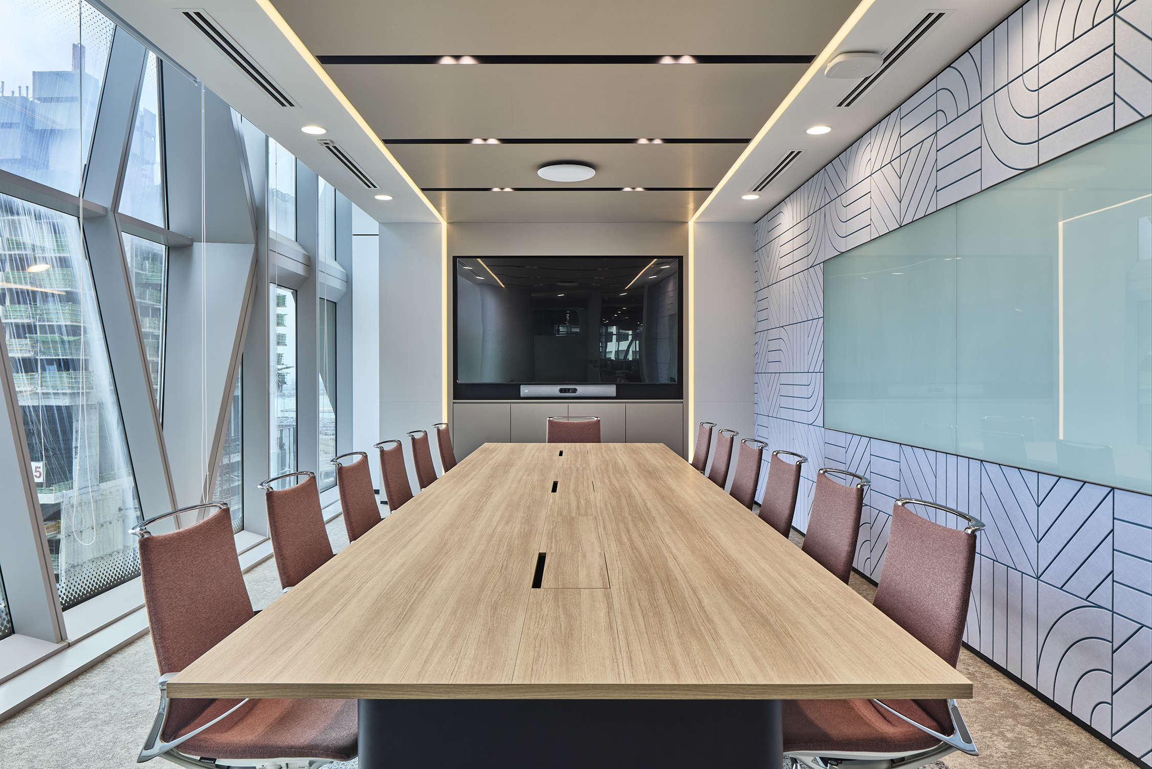 A refined boardroom where symmetry, acoustics and integrated technology support clear and confident discussions.
