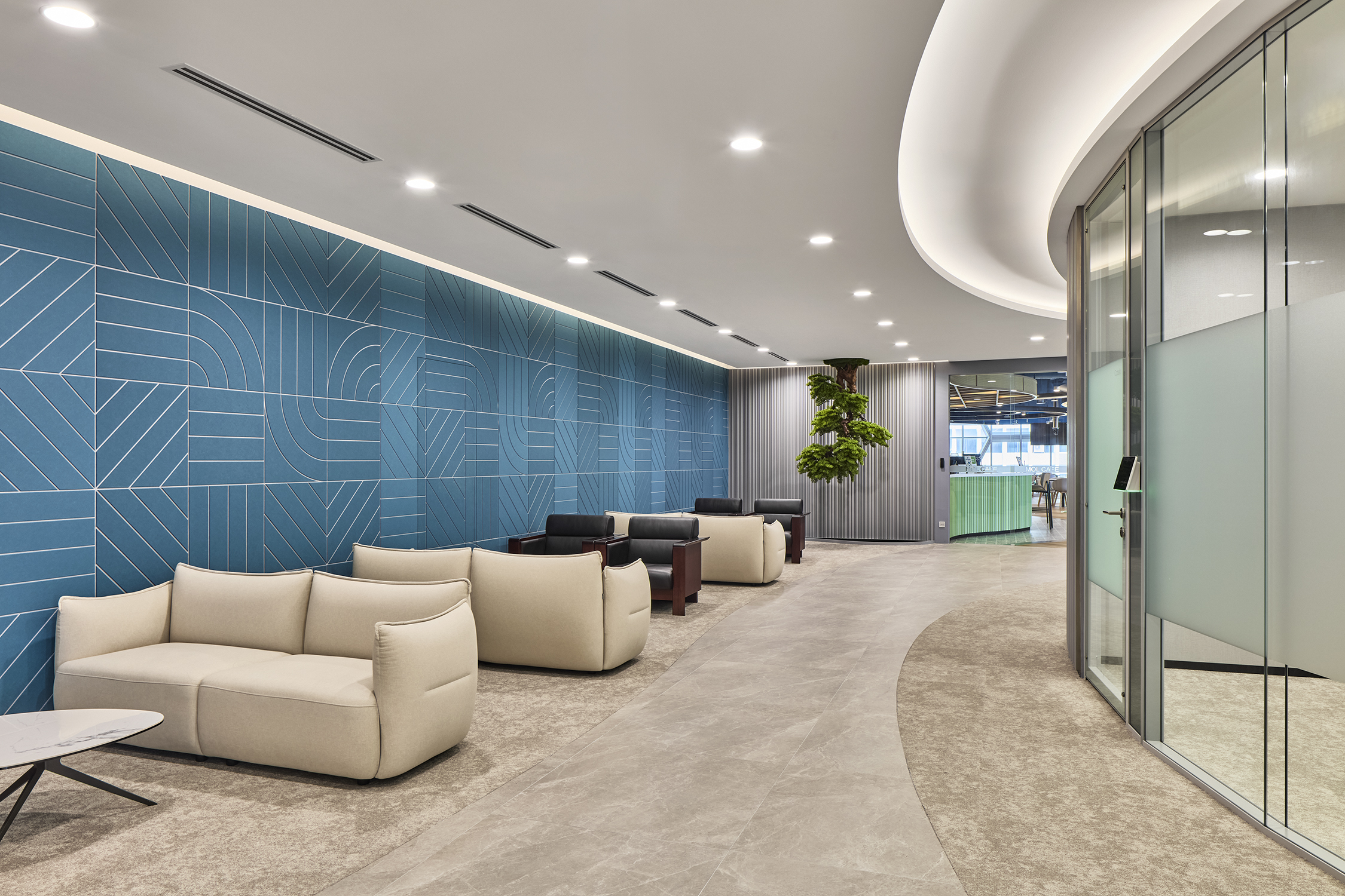 Defined by a bold geometric acoustic wall in deep blue tones, the space introduces a strong visual identity while maintaining a calm and composed atmosphere. Soft lounge seating supports both individual pause and informal interaction, balancing comfort with spatial clarity.