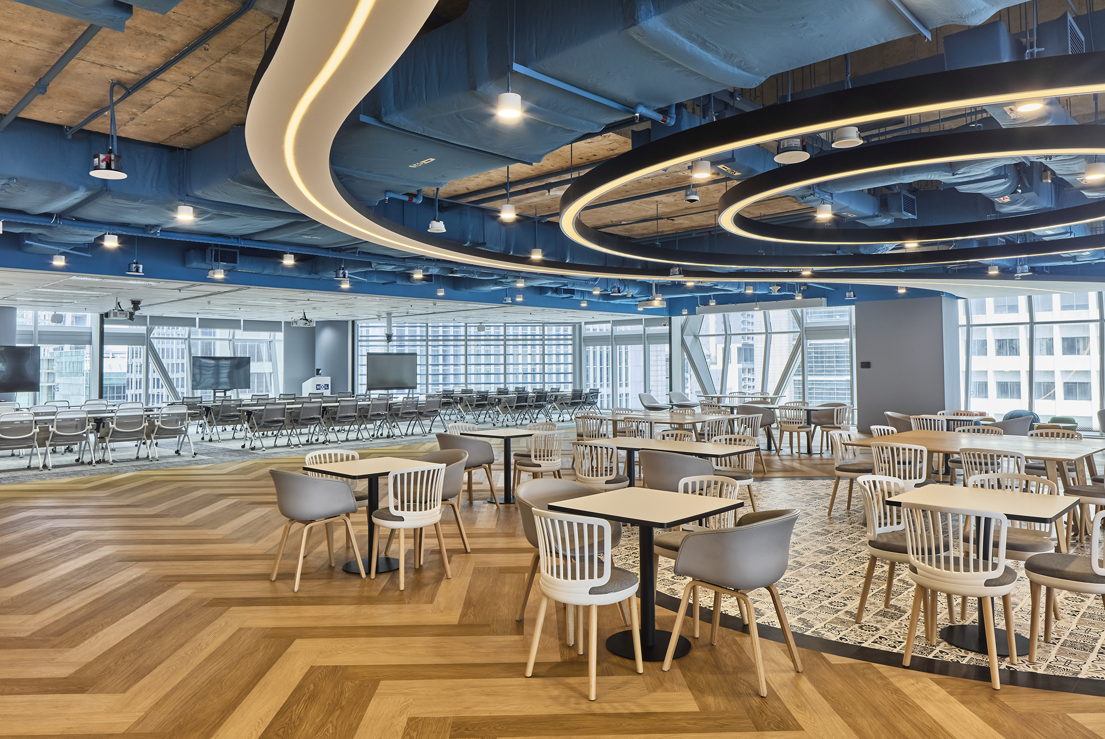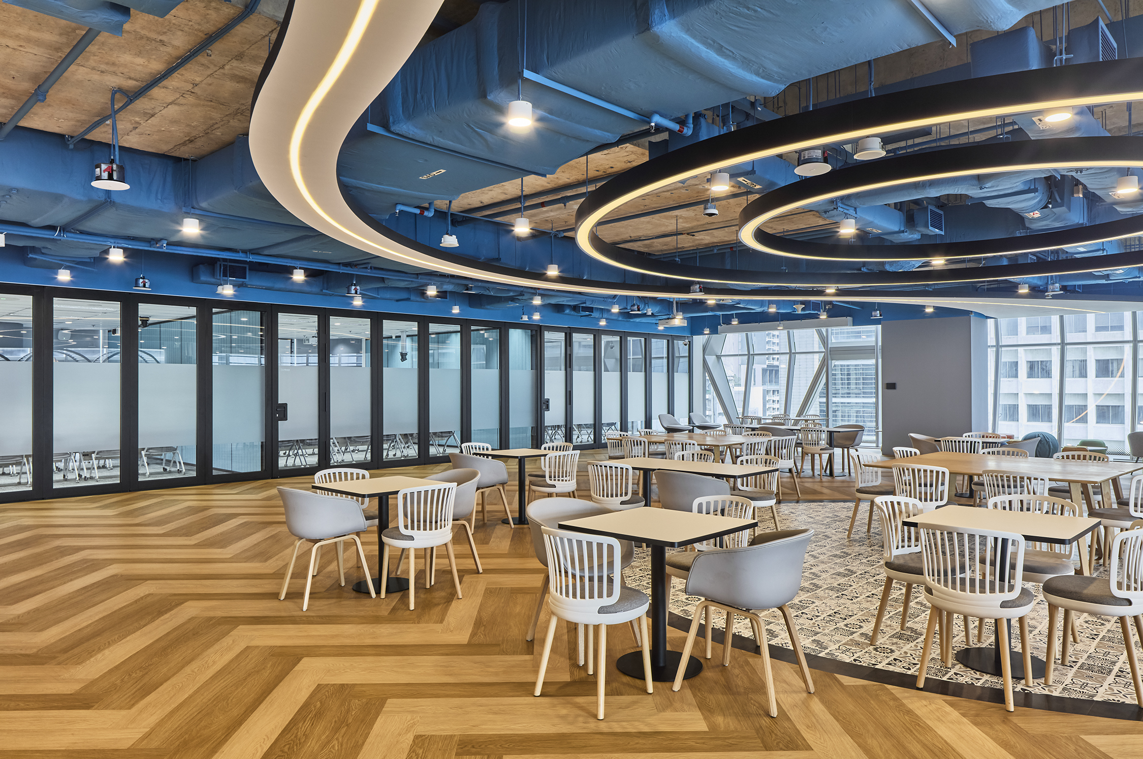The MOL Café is reimagined as a vibrant social hub, the pantry draws on café inspired hospitality with a sculpted bar counter and expressive ceiling lighting. A combination of textured finishes and patterned surfaces creates visual identity while maintaining spatial clarity within the open plan.